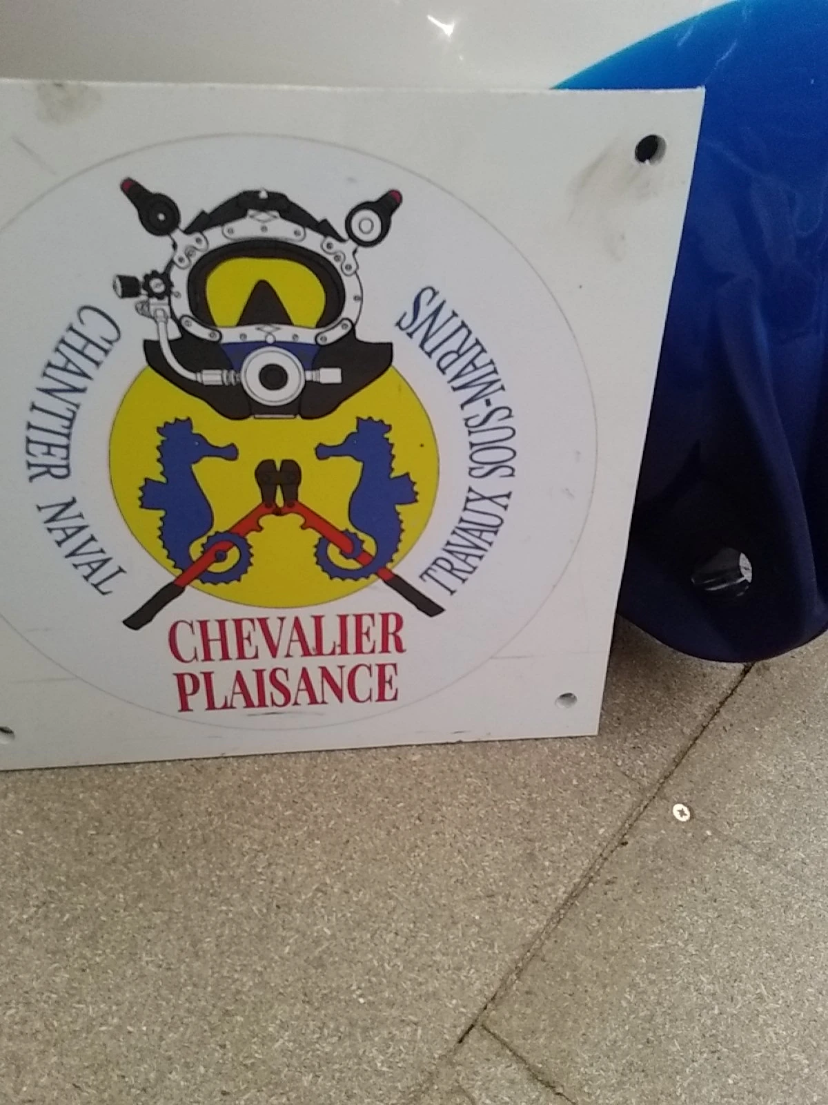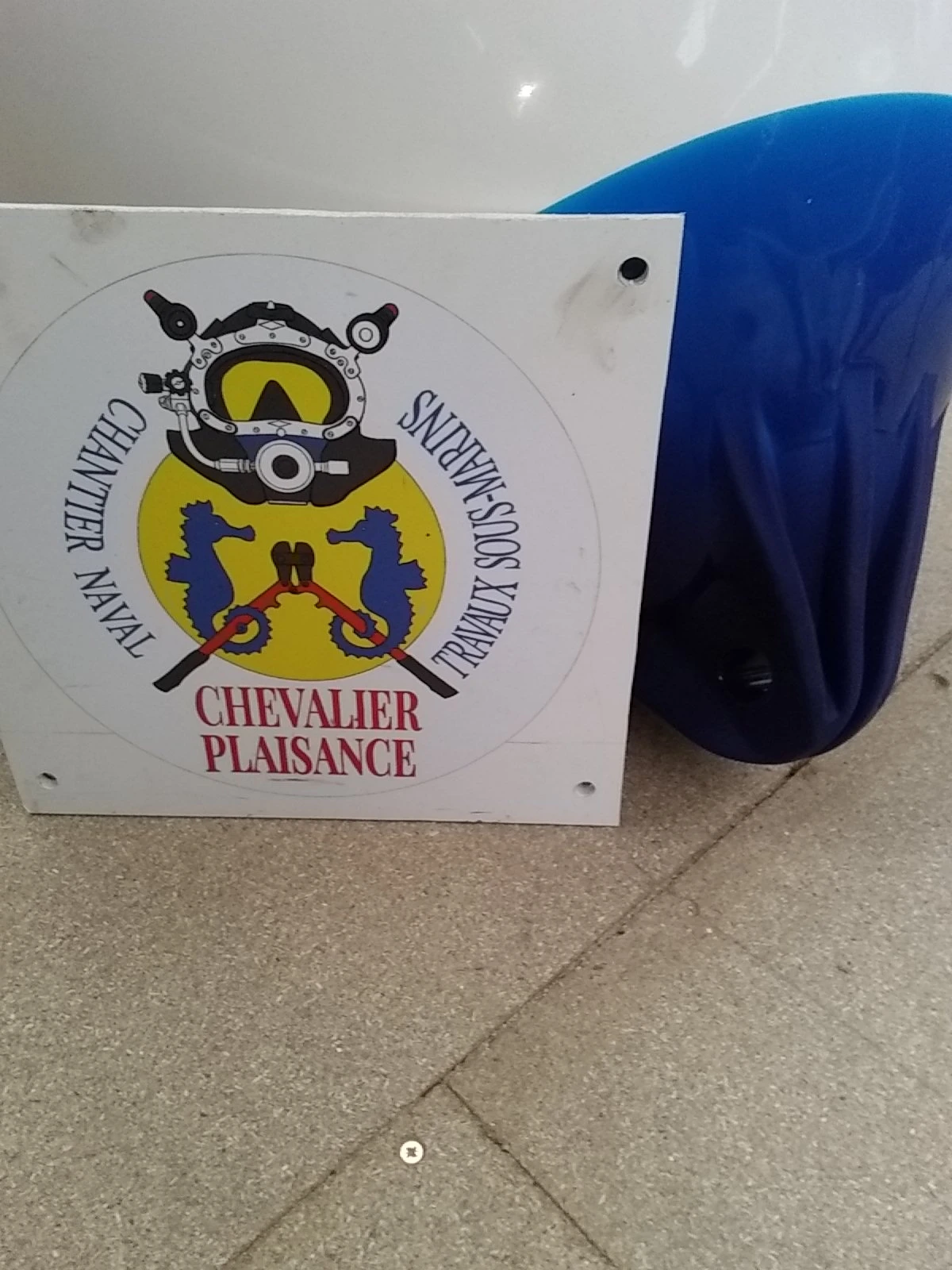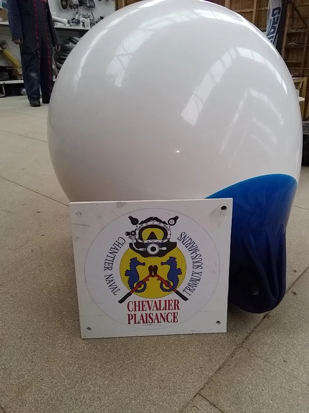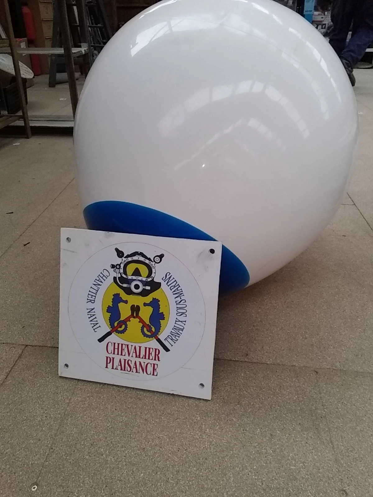 Flotteur Blanc fabriqué en une seule pièce avec un anneau injecté renforcé Bleu et corps sphérique surmoulé en Rotomoulage.